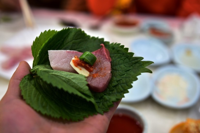 여기에 채썬 무, 깻잎, 초생강, 마늘, 고추, 김 등을 곁들이면